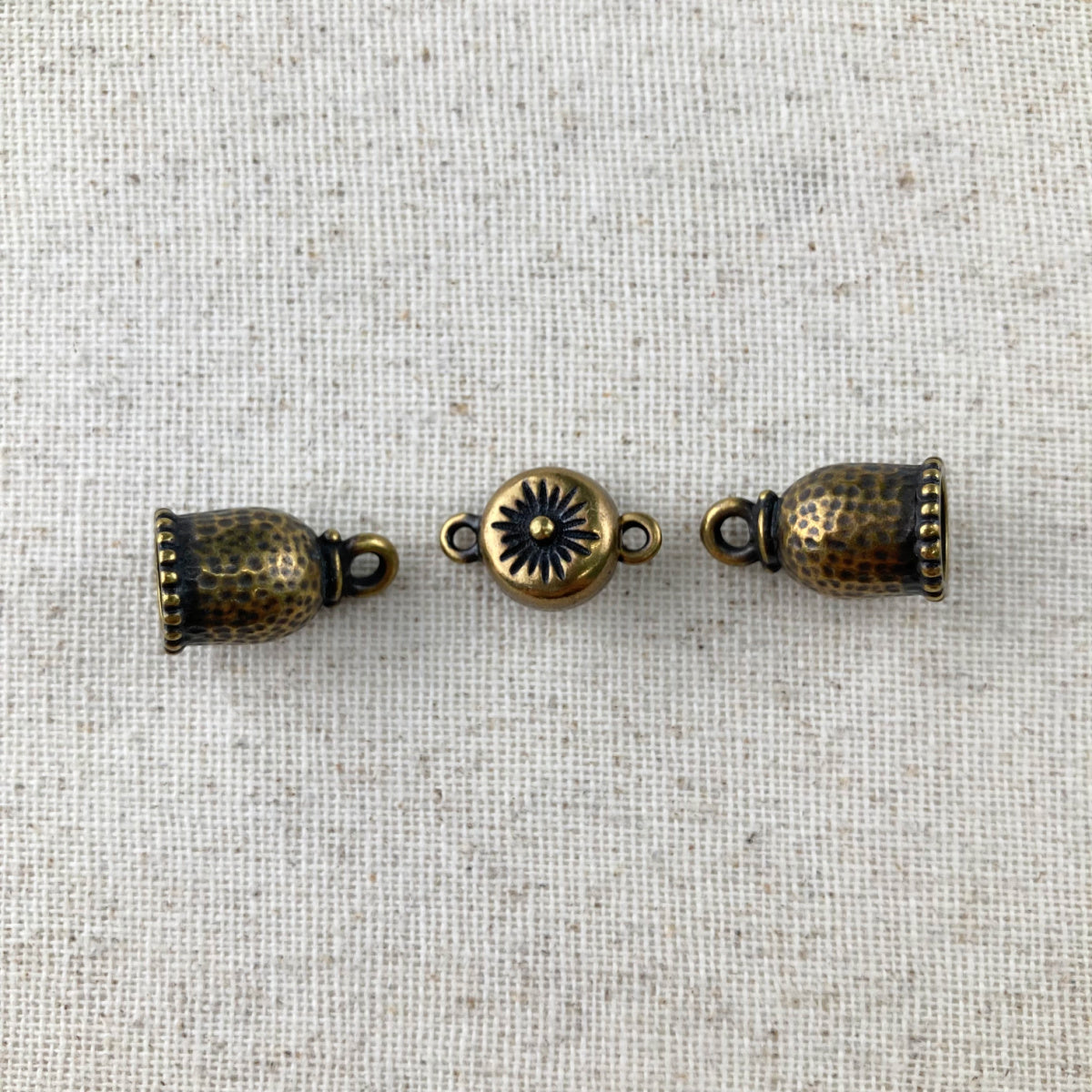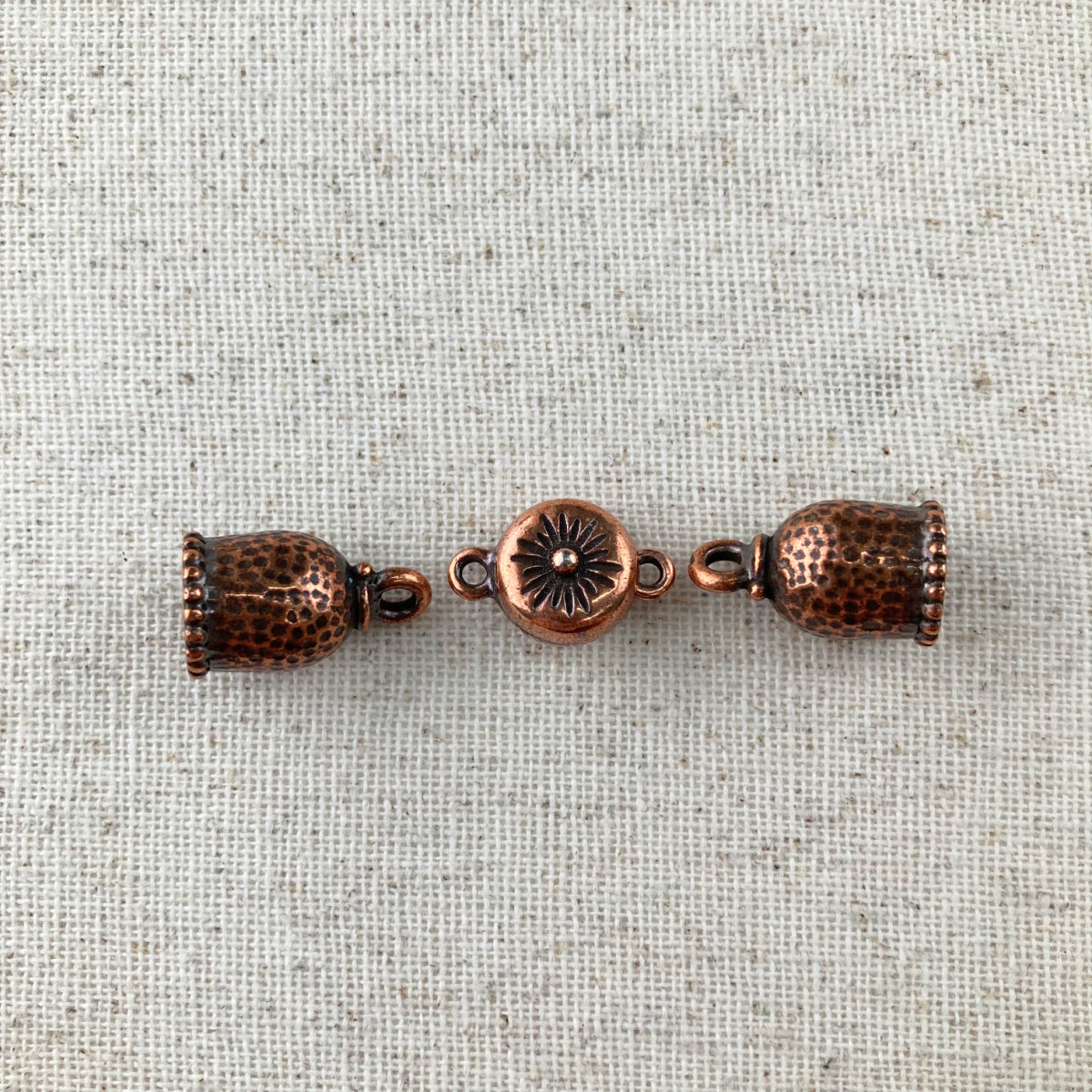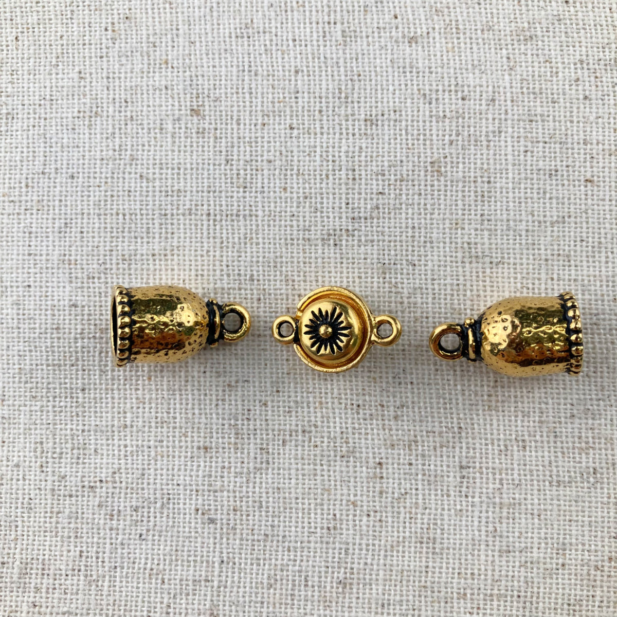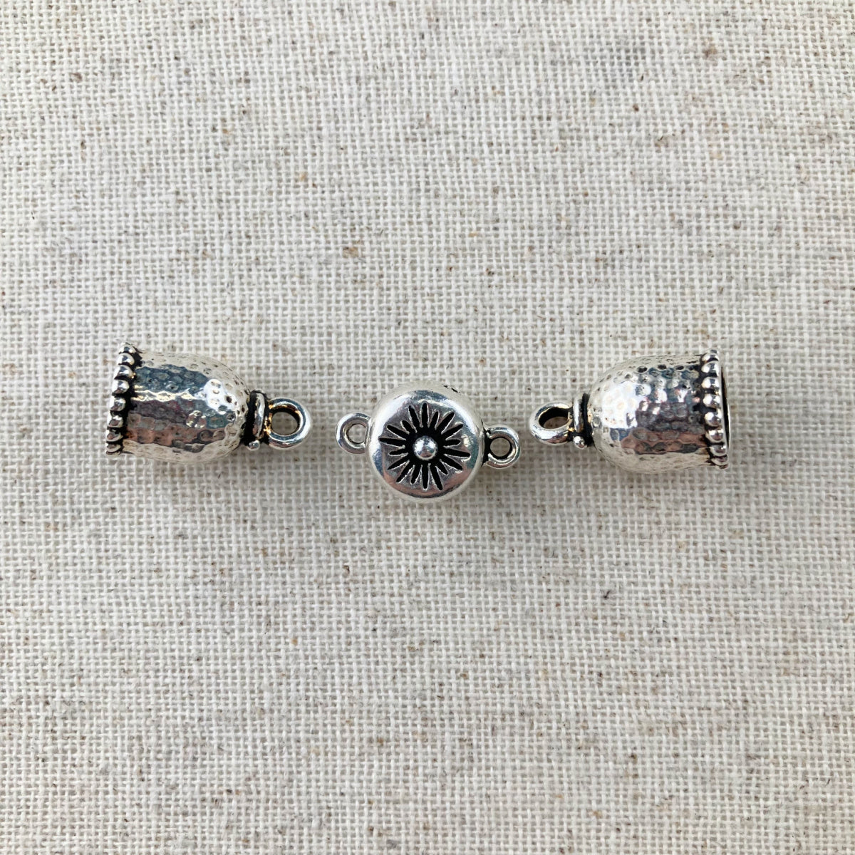 This 8mm TierraCast Endcap Set with Starburst Magnetic Clasp includes two 8mm Palace endcaps, one Starburst magnetic clasp, and four jump rings. You will need two pairs of jewelry pliers to assemble the set. The length of the assembled set is 2 1/8". Because the ends of your beaded braids fit inside the endcaps, this set typically adds about 1 1/2" to the finished length of your braid.