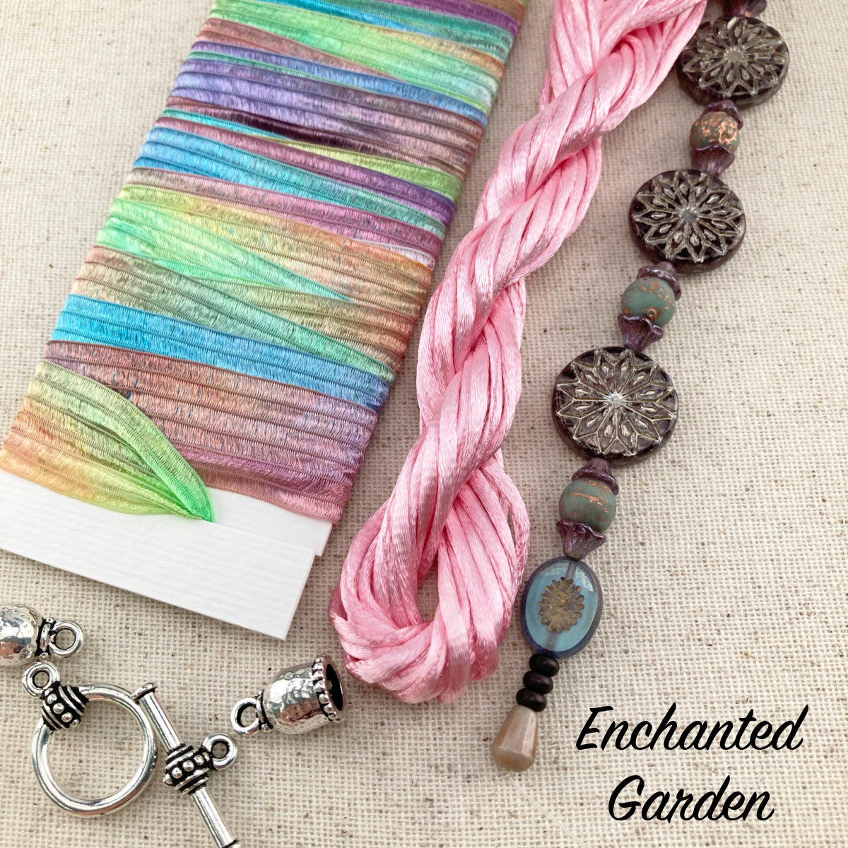 From the tassel you'll braid a necklace using a "no-knot start" using either a combination of Aratashi ribbon and satin or two colors of satin depending on your kit colorway. You'll finish your necklace with elegant TierraCast endcaps and a matching toggle clasp.