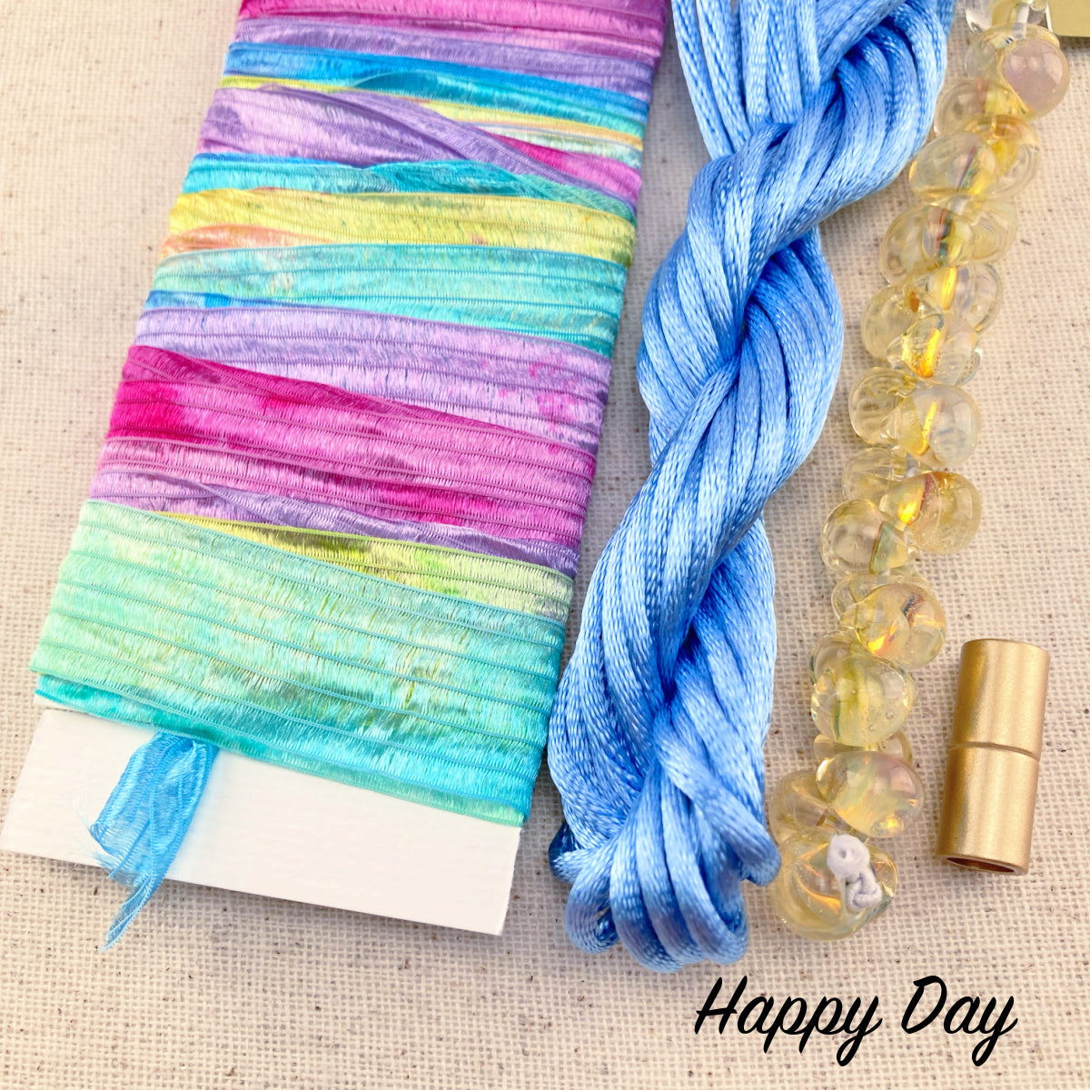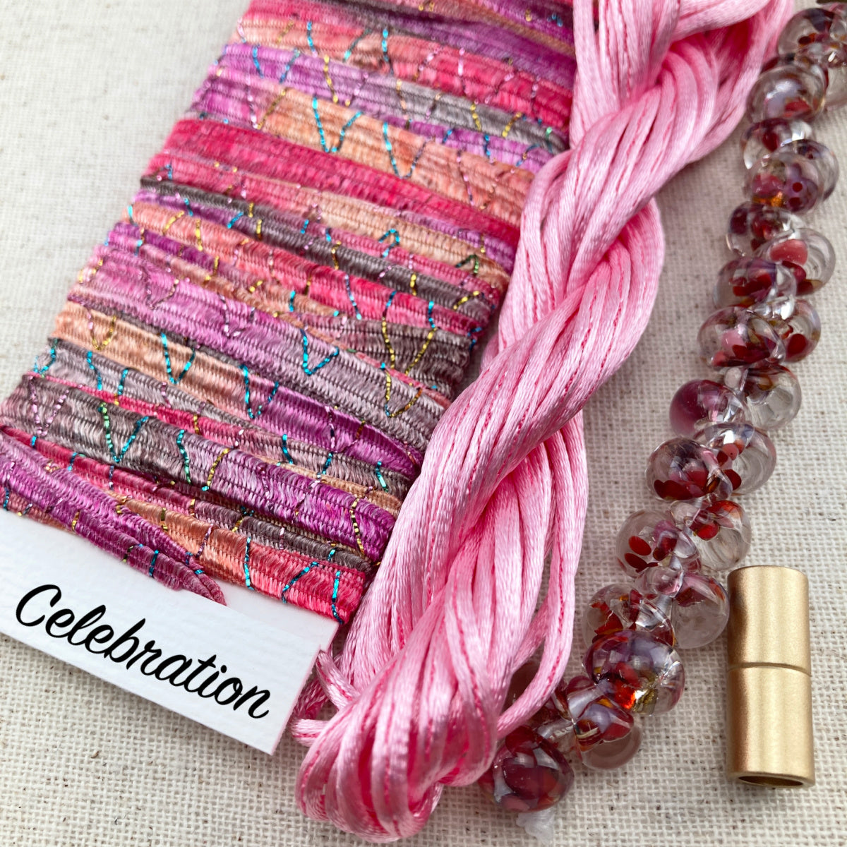 Often times with kumihimo, you have to choose what will take center stage: the beads or the braid? In the Harmony necklace, they work together. The teardrop beads hang gracefully from the edge of the braid; their size and shape compliment the texture of the braid and enhance it. The smooth round satin cord provides structure, strength, and stability to the braid while the variegated adds delightfully shifting colors and metallic accents.