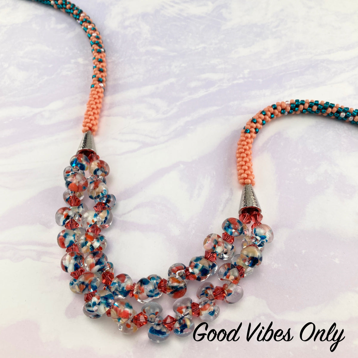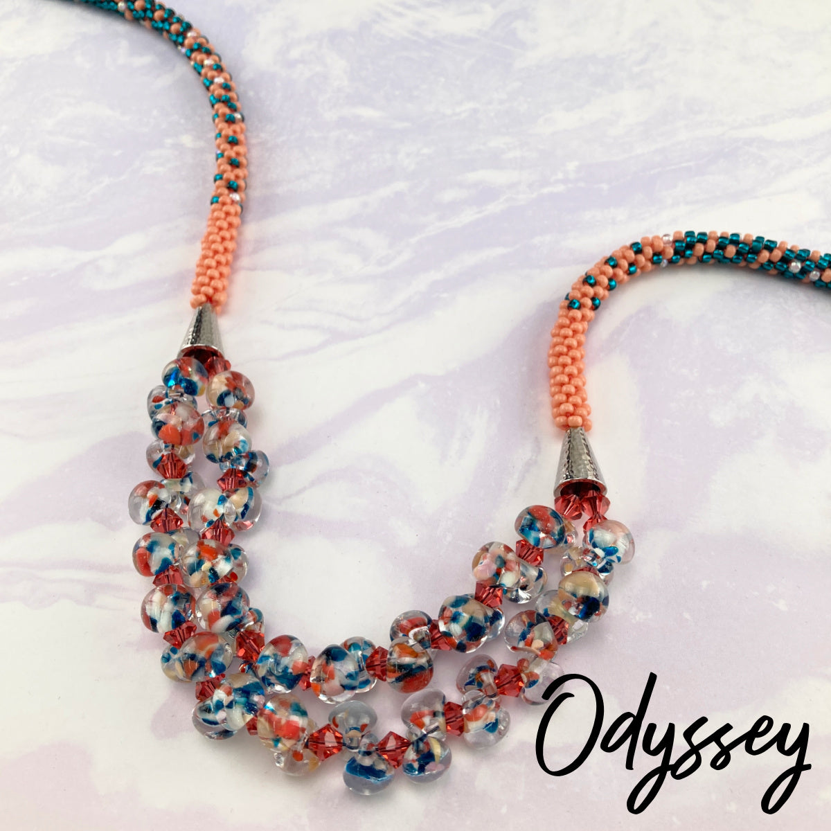 The Odyssey features a luxurious double-strand focal section of handmade lampwork teardrop beads and Czech crystal bicones strung between TierraCast cones in a timeless hammered texture. Kumihimo beaded ropes of size 8 seed beads begin directly from the cones and transition through a smooth two-color ombré with subtle accents. Stainless steel magnetic endcaps are hidden under coordinating peyote stitch endcap covers.